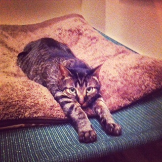 "BK is a 3-year-old tabby was also adopted form the Austin Humane Society and her favorite things to do include chewing on string, eating, and sleeping on Polly's beds."