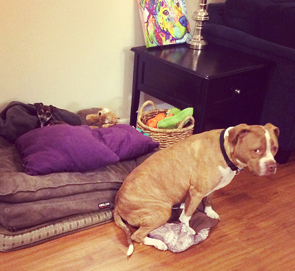 About Brooke's babies: "Polly is a 5-year-old Pit bull mix adopted from the Austin Humane Society when she was two months old. She loves clean laundry, going to Red Bud Isle, peanut butter Kongs and her Beagle cousins."