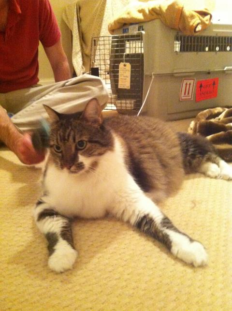 Sam is a 10-year-old Maine Coon cat who weighs in at 25 lbs. We inherited him after our mother passed away. Having him be moved safely across the country was of enormous importance to us. The team at PetRelocation.com couldn't have been more supportive. They explained each step in the process, walked us through all the necessary logistics, and understood when we delayed the move several times. This picture is taken just 10 minutes after Sam arrived at the end of 12 hours of travel. Thanks to the team for tracking his every step and keeping us up to date - including a two hour delay by Continental because of bad weather! We truly appreciate everything you did!