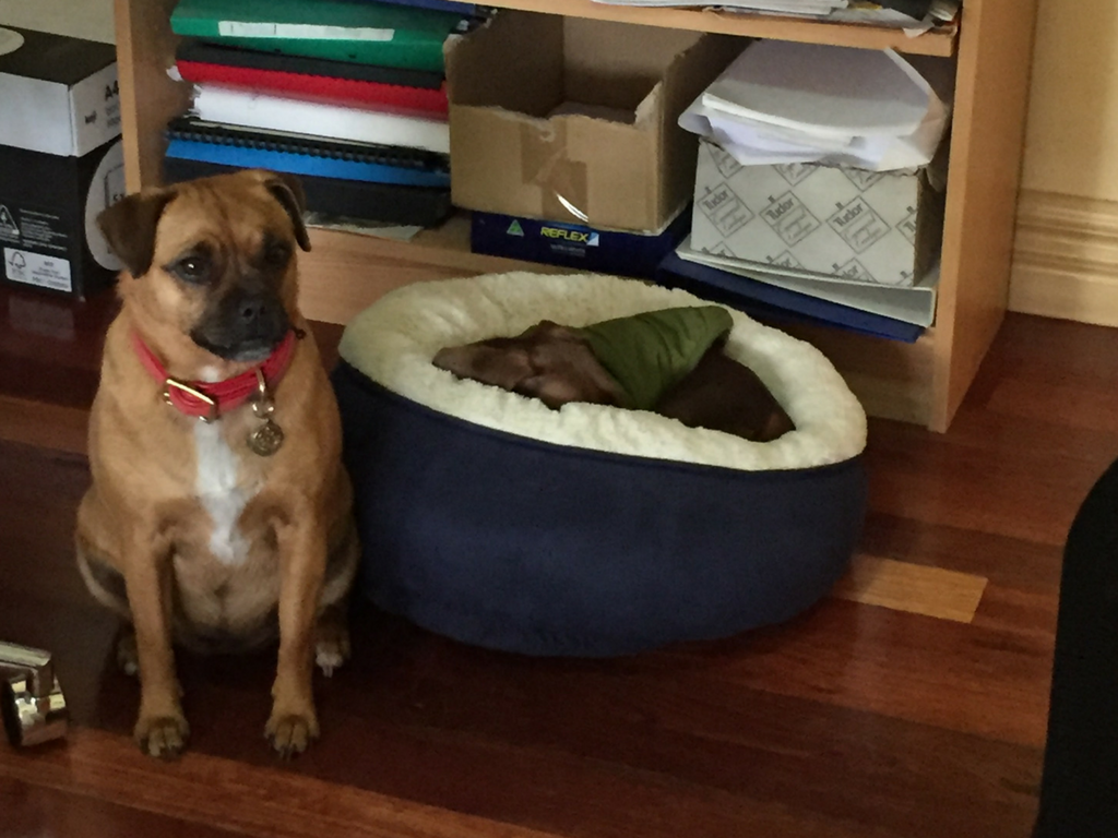 He is loving his new house - he has a backyard for the first time so plenty of room to explore. I've attached a photo of him sleeping, guarded by his new friend Lexie, and another with the two of us.